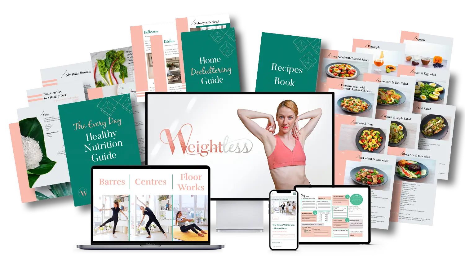 A healthy body can be seen on the outside, but we have to look after the inside first. I believe that a balanced lifestyle that starts from within. That's why Weightless includes a comprehensive guide to healthy nutrition. Discover delicious recipes and learn how to nourish your body in a way that supports your fitness goals. Fuel yourself with vitality and discover the wonders of wholesome eating. Donât worry youâll never have to follow a restrictive diet ever again, finding balance in your lifestyle is also understanding how to enjoy your favourite dessert every now and then!